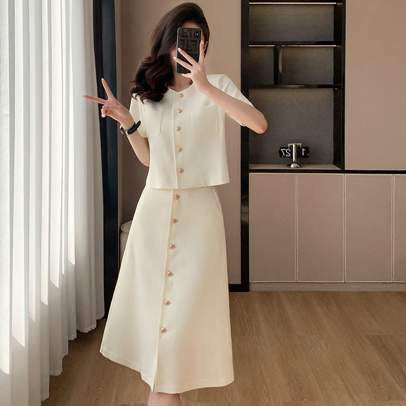Setelan pakaian leher bulat elegan setelan wanita musim semi dan musim panas baru warna polos sederhana gaya Barat setelan pendek a-line rok payung setelan dua potong