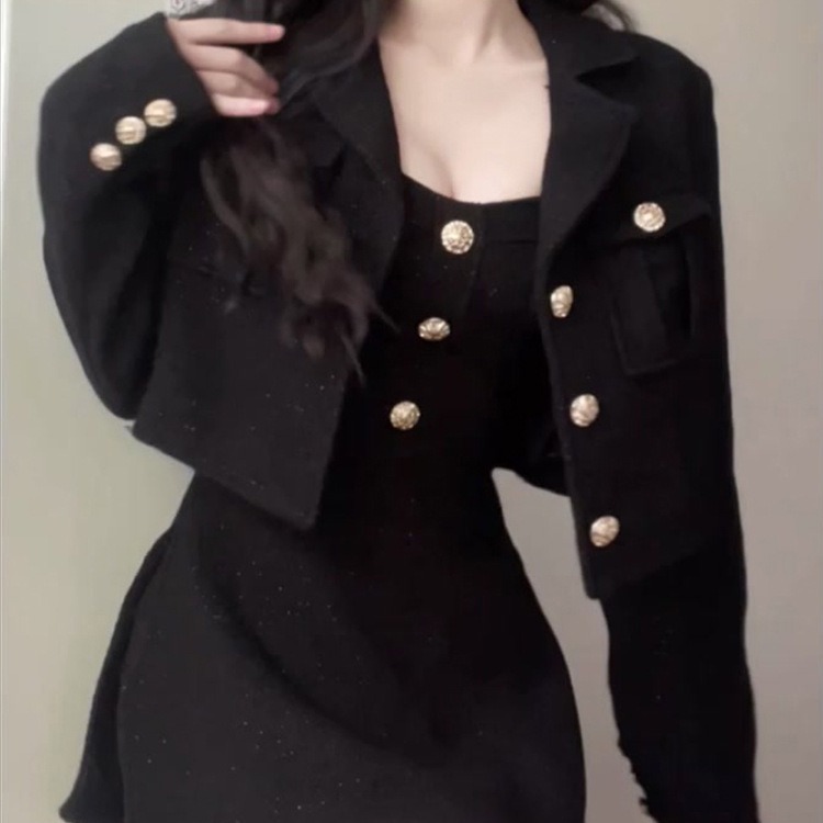 Setelan rok pendek gaya Korea kecil wanita, pakaian rok pendek dua potong gaya selebriti online hitam