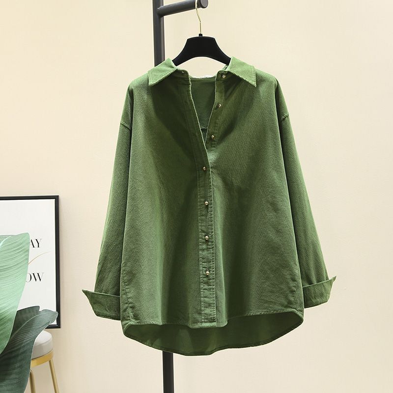 Kemeja Ditambah Tebal Korduroi Warna Kopi Kemeja Kardigan Lengan Panjang Warna Solid Longgar Sederhana Model Baru Musim Gugur Musim Dingin 2024 Wanita
