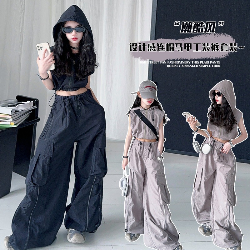 女童工装套装2025年新款春夏款美式小众设计休闲裤抽绳宽松连帽衫