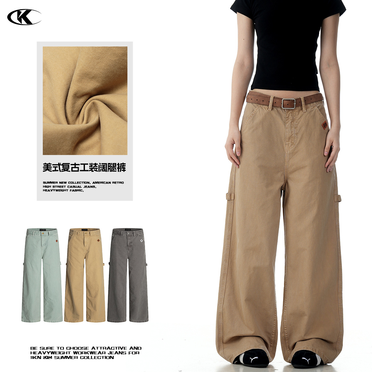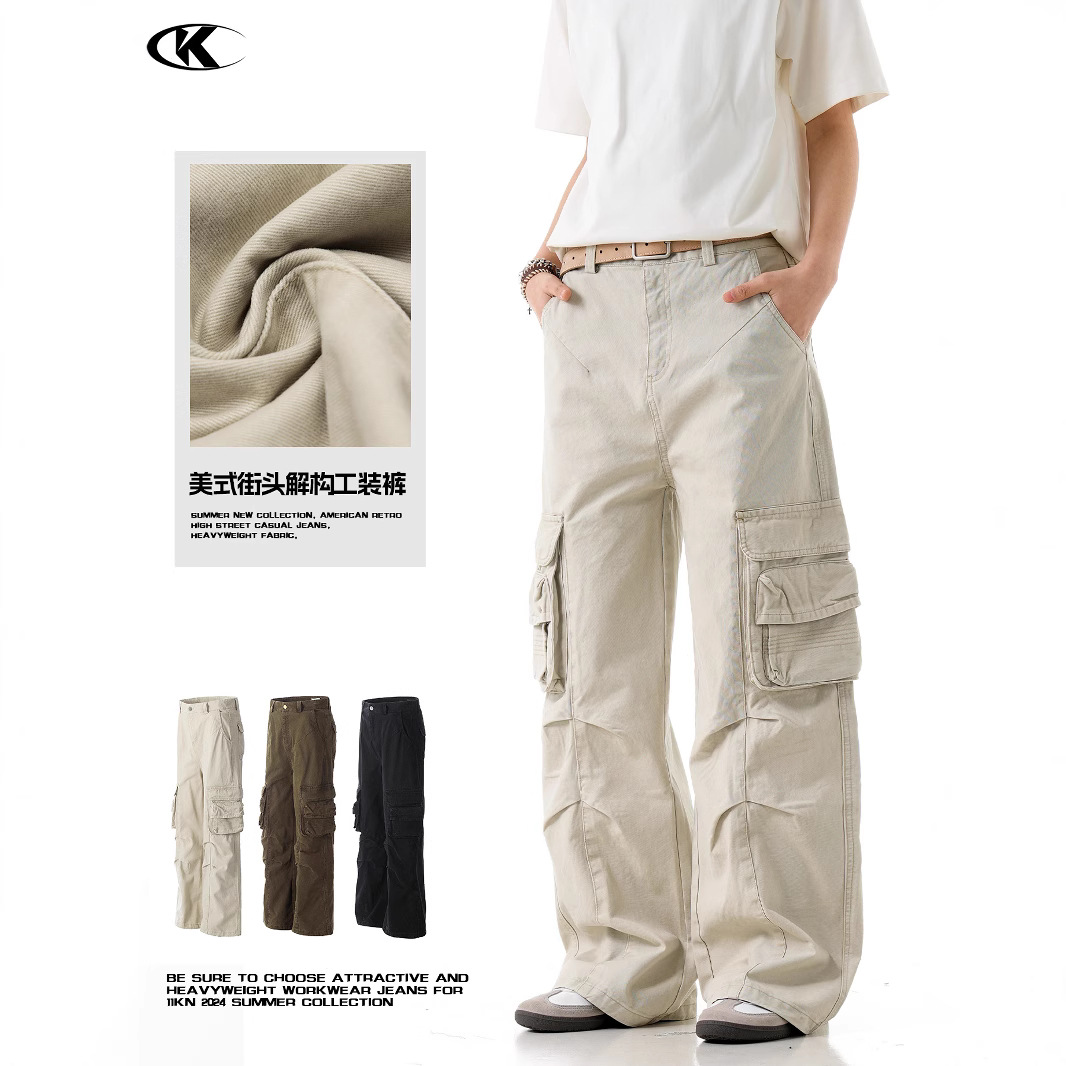 11KN Celana Kerja Retro Gaya Amerika Celana Kasual Lurus Terlihat Ramping Katun Murni Tiga Dimensi Trendi Longgar Lipit Banyak Saku Pria Wanita