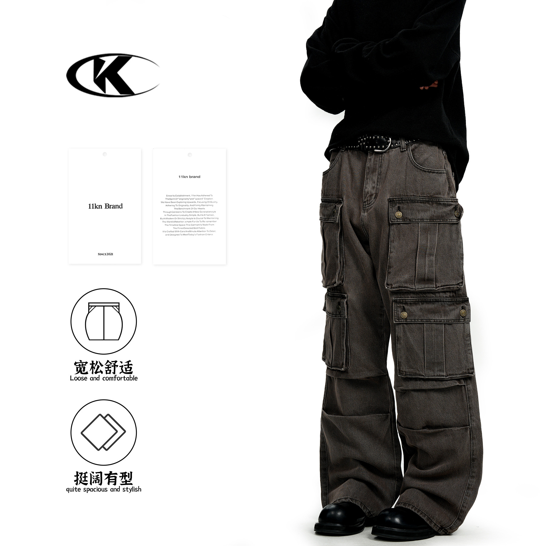 Celana Kargo Denim Multi Saku Gaya Amerika 11KN Celana Panjang Kasual Pelangsing Vintage Longgar Lurus Uniseks