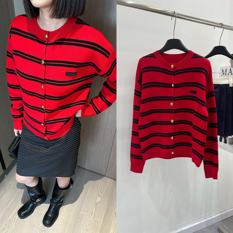 2025秋冬红黑宽条纹字母标金扣长袖圆领针织开衫修身羊毛女款上衣