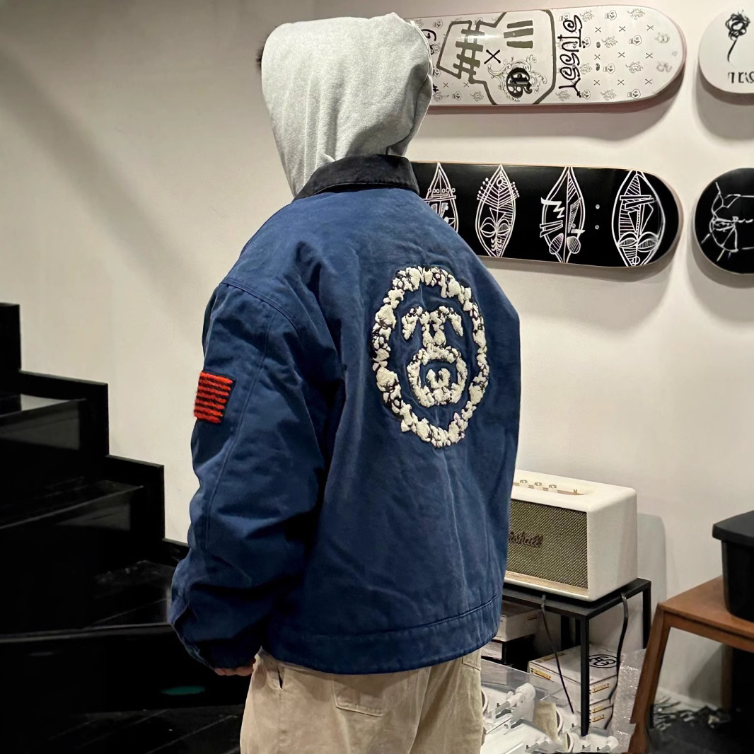 Stu x Den Jaket Pakaian Kerja Jaket Berlapis Katun Trendi Jaket Logo Bulat Dada Retro Gaya Amerika
