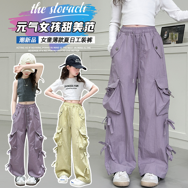 2025 Celana Perkakas Anak Perempuan Musim Semi Musim Panas Celana Tipis Anak Perempuan Besar Pakaian Anak Perempuan Celana Kaki Lebar Lurus Celana Kasual Anak