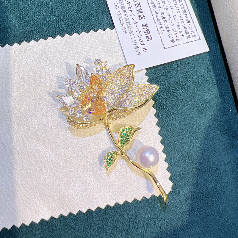 Aksesori DIY bros lotus elegan kelas atas tembaga mikro bertatahkan zirkon tebal berlapis emas pin mutiara korsase dukungan kosong