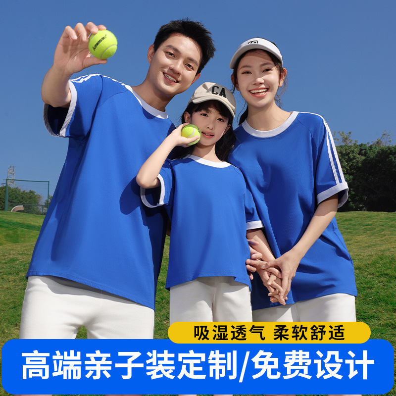 亲子装三条杠拼色T恤大人男女童撞色圆领短袖旅游活动服定 制logo