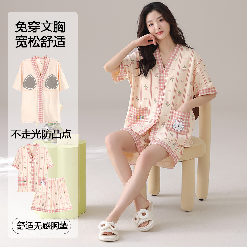 2025年女士高级感家居服套装纯棉睡衣短裤和尚领自带胸垫开衫夏天