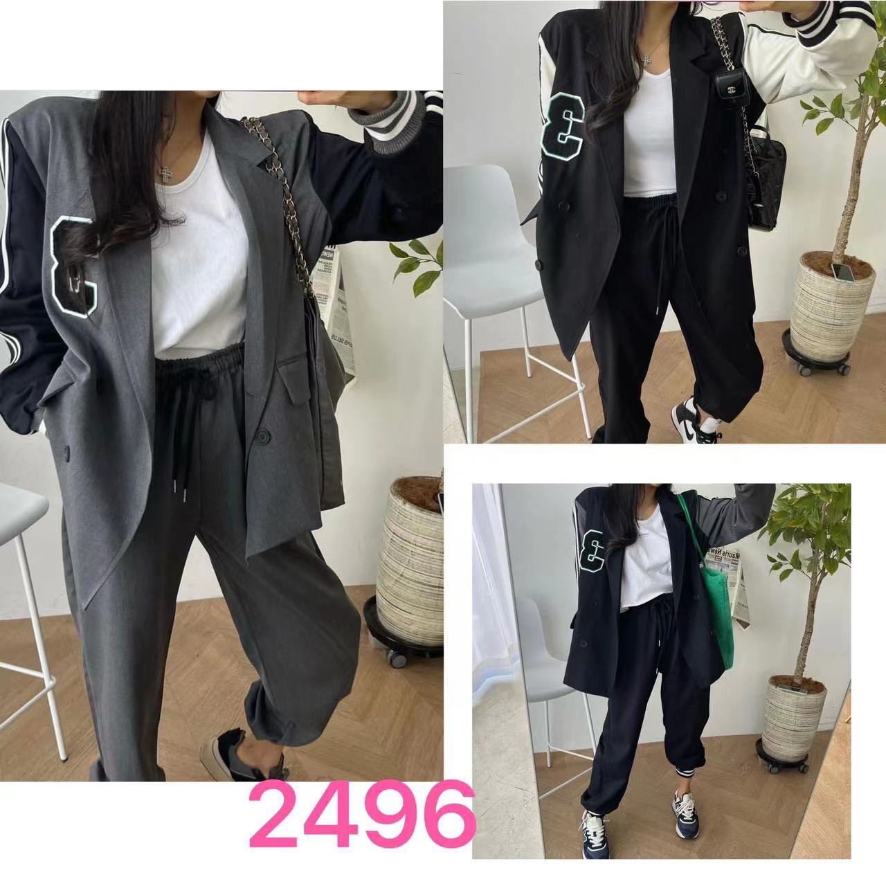 新款拼接西装袖上衣加松紧系绳螺纹束脚裤西装两件套