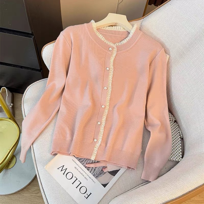 软糯甜美拼接木耳边蕾丝圆领长袖针织开衫女秋冬季减龄小外套上衣