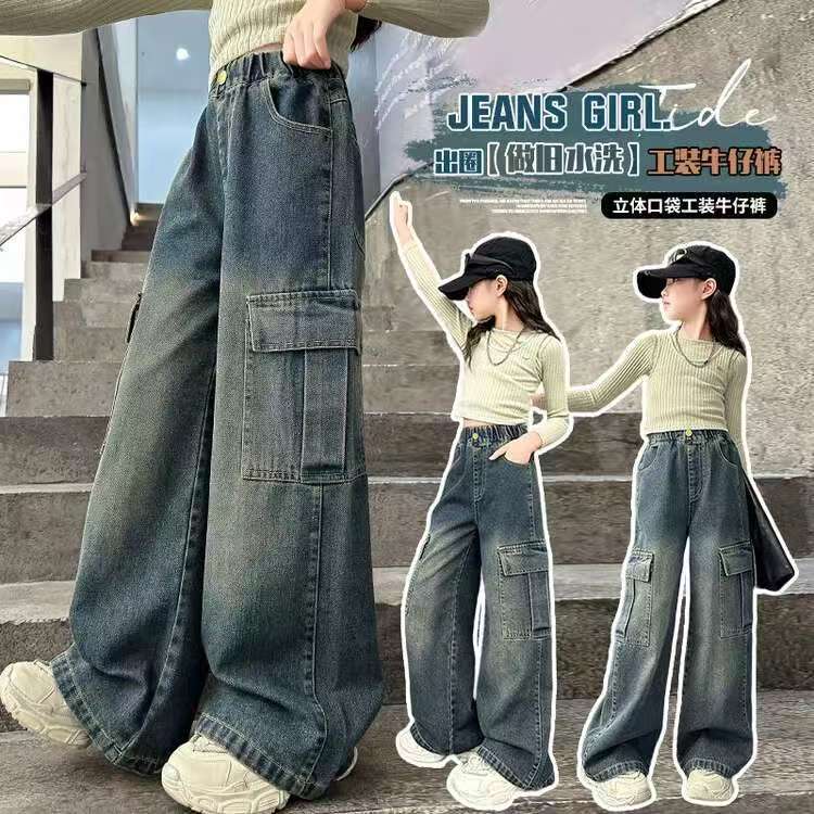 女童裤子春秋装2025新款工装阔腿裤洋气时髦儿童中大童宽松牛仔裤