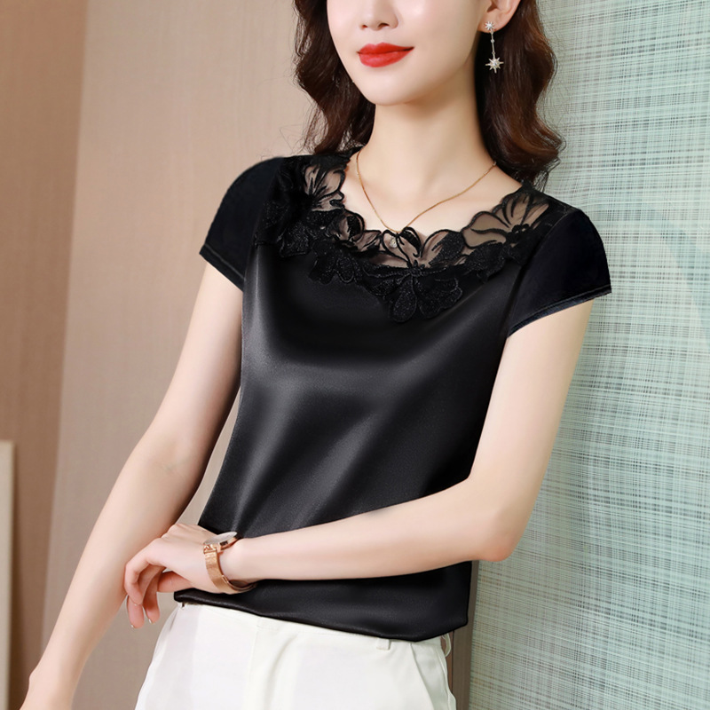 Kaos Dalaman wanita, setelan pakaian luar musim panas wanita ukuran besar penutup daging dengan renda gaya Barat pengurang usia atas lengan pendek