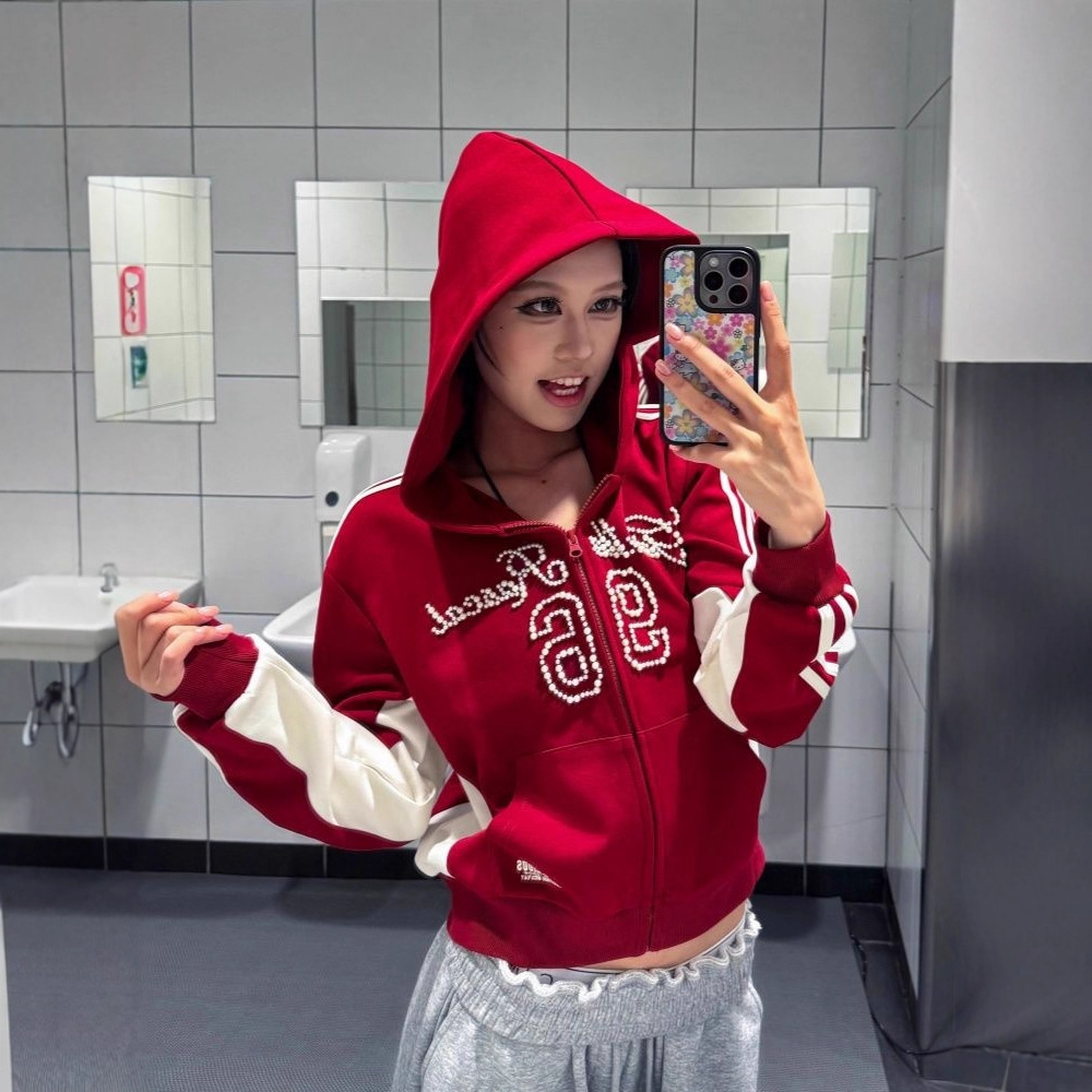 小众设计感拉链开衫卫衣女秋季新款钉珠字母印花连帽休闲外套上衣