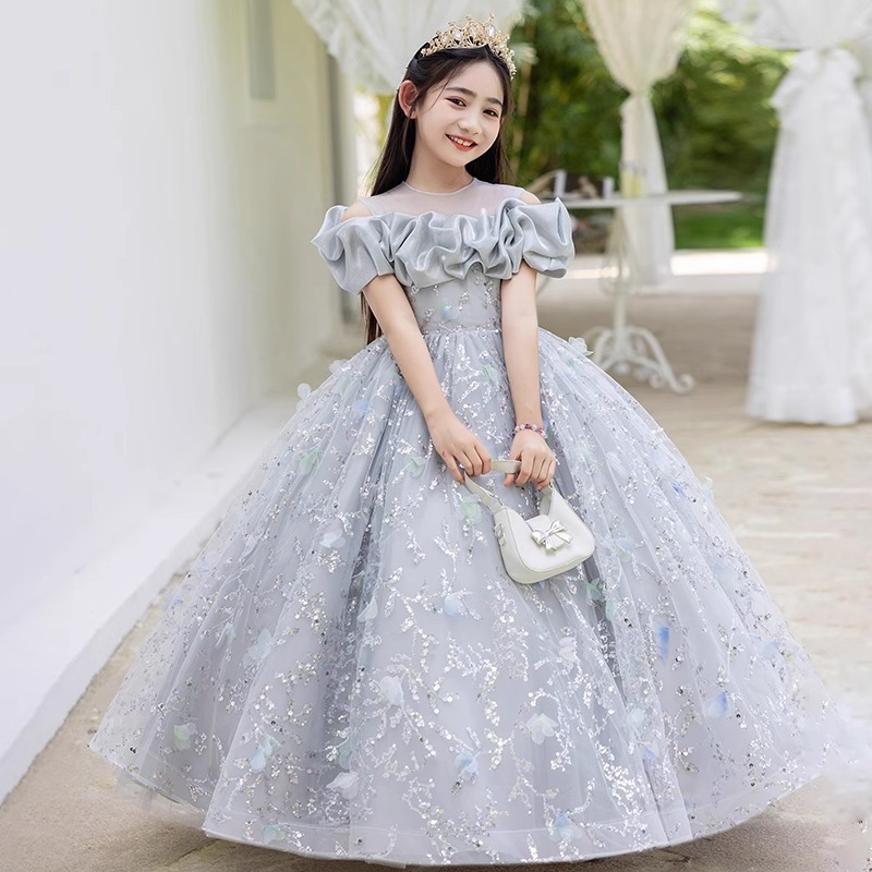 Gaun Anak-anak Gaun Putri Gaun Malam Anak Perempuan Warna Abu-abu Estetika Model Pertunjukan Ulang Tahun Pertunjukan Piano Host