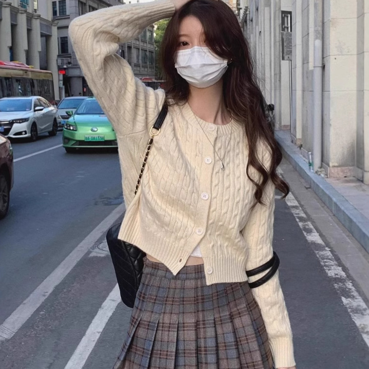 Jaket Sweater Twist Model Pendek Retro Atasan Kardigan Rajutan Pria Kecil Warna Polos Gaya Kampus Dalaman Musim Semi Musim Gugur Wanita