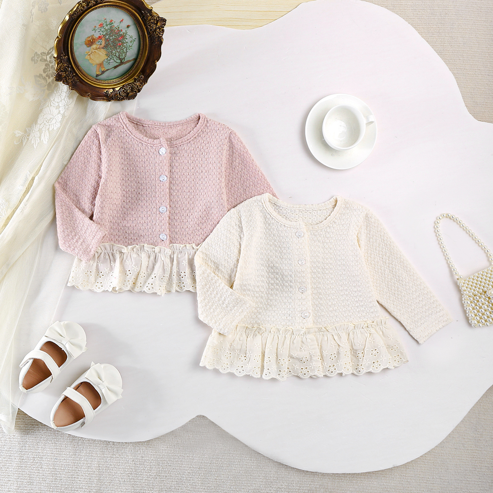 童装女童秋装开衫上衣韩系宝宝甜美拼接蕾丝花边针织百搭薄款外套