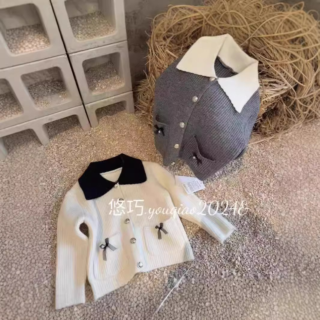 Jaket Kardigan Rajut Pita Kupu-Kupu Bayi Perempuan Lucu Warna Kontras Kerah Anak Perempuan Gaya Chanel Musim Gugur Musim Dingin Model Baru 24 Korea