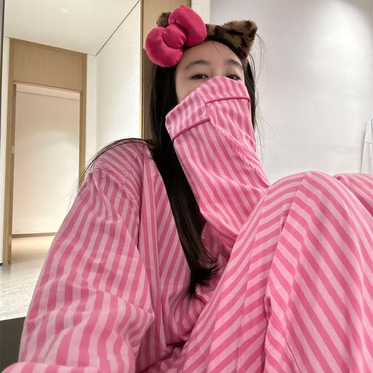 家居春秋款服条纹长袖两件睡衣慵懒粉色开衫家居服套装女装空调服