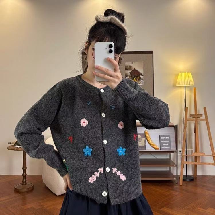 【绵羊绒】韩系花朵刺绣针织开衫2025秋冬新款百搭温柔毛衣外套女