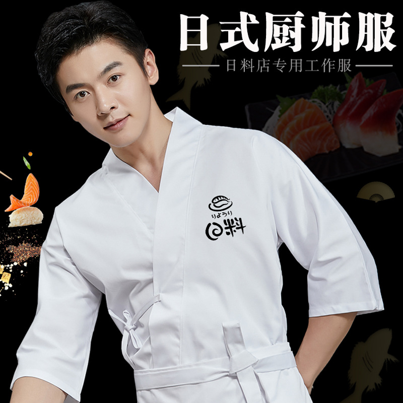 Kimono lengan panjang pria, baju koki Jepang warna polos, lengan panjang, restoran, putih, koki, pakaian dapur