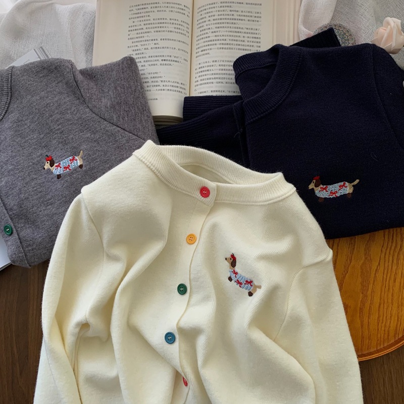 Tembakan nyata ◆ bunny retro ~ Kardigan Rajut Dasar Bordir Katun Murni Warna Solid