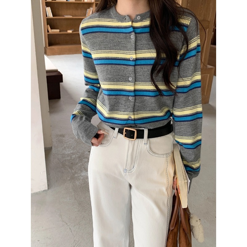 3th Morning 秋意摩卡 韩系简约圆领撞色条纹针织开衫ZY3412