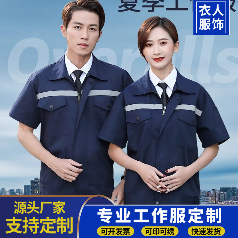 Pakaian kerja pria lengan pendek, baju perbaikan mobil, pakaian kustom lengan pendek, pakaian kerja gesper katun, poliester, tahan noda, pakaian musim panas