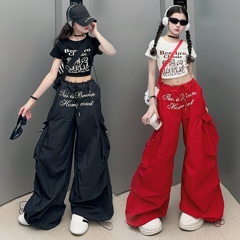 2025夏款美式发泡小狗印花短袖T恤+美式字母刺绣伞兵工装裤两件套
