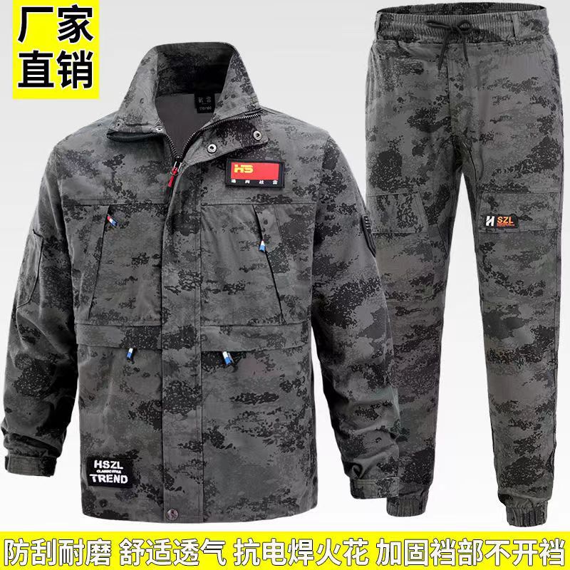 Pakaian setelan kamuflase elastis pria, pakaian kerja pria, pakaian pelindung kerja, pekerja lokasi konstruksi, anti aus, pakaian kamuflase elastis musim semi dan musim gugur