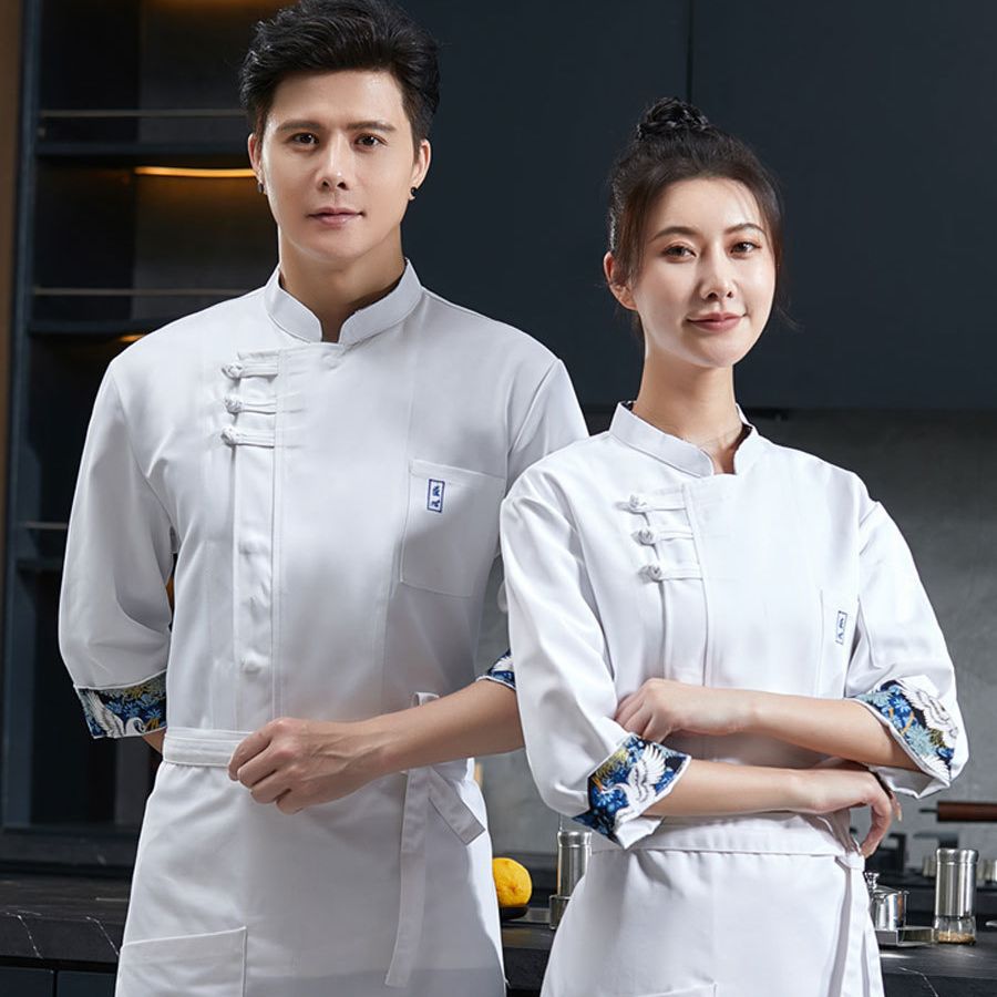Pakaian koki Lengan tiga perempat pria, pakaian kerja dapur sekolah memanggang restoran, gaya Cina lengan tiga perempat untuk lelaki