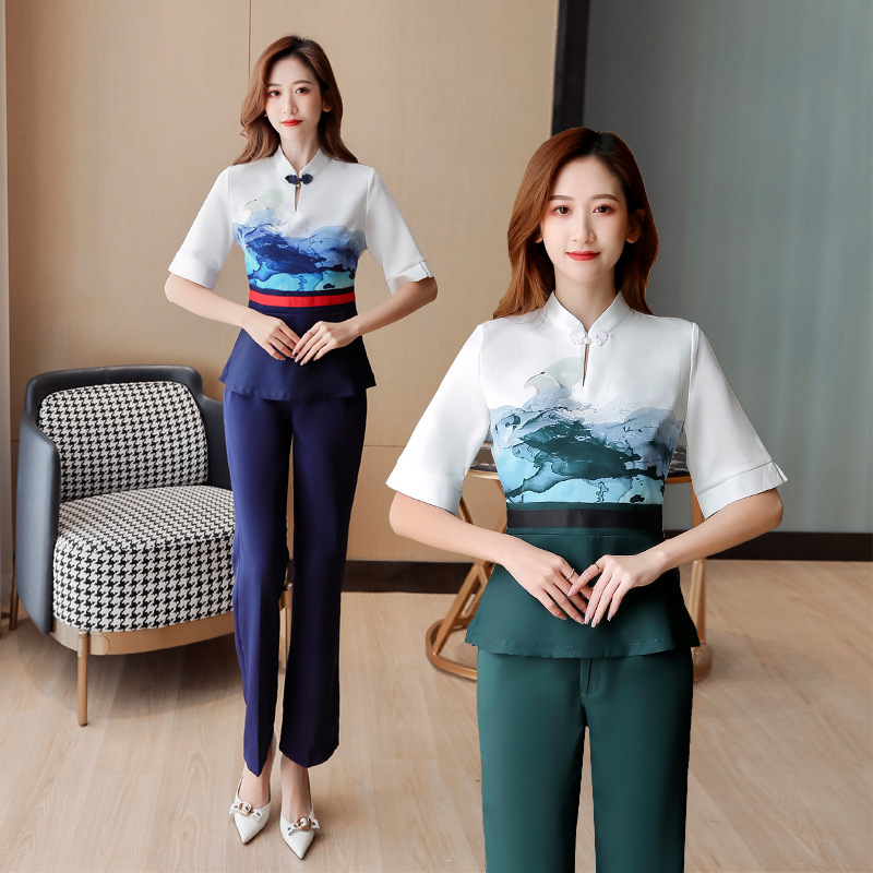 Setelan profesional pakaian Tiongkok musim semi dan musim panas seragam kerja pelayan restoran penerimaan meja depan hotel wanita