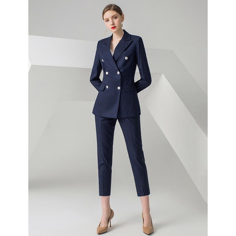 EWY jaket setelan bisnis wanita, jaket kecil biru dongker gaya Korea dua baris setelan wawancara temperamen OL