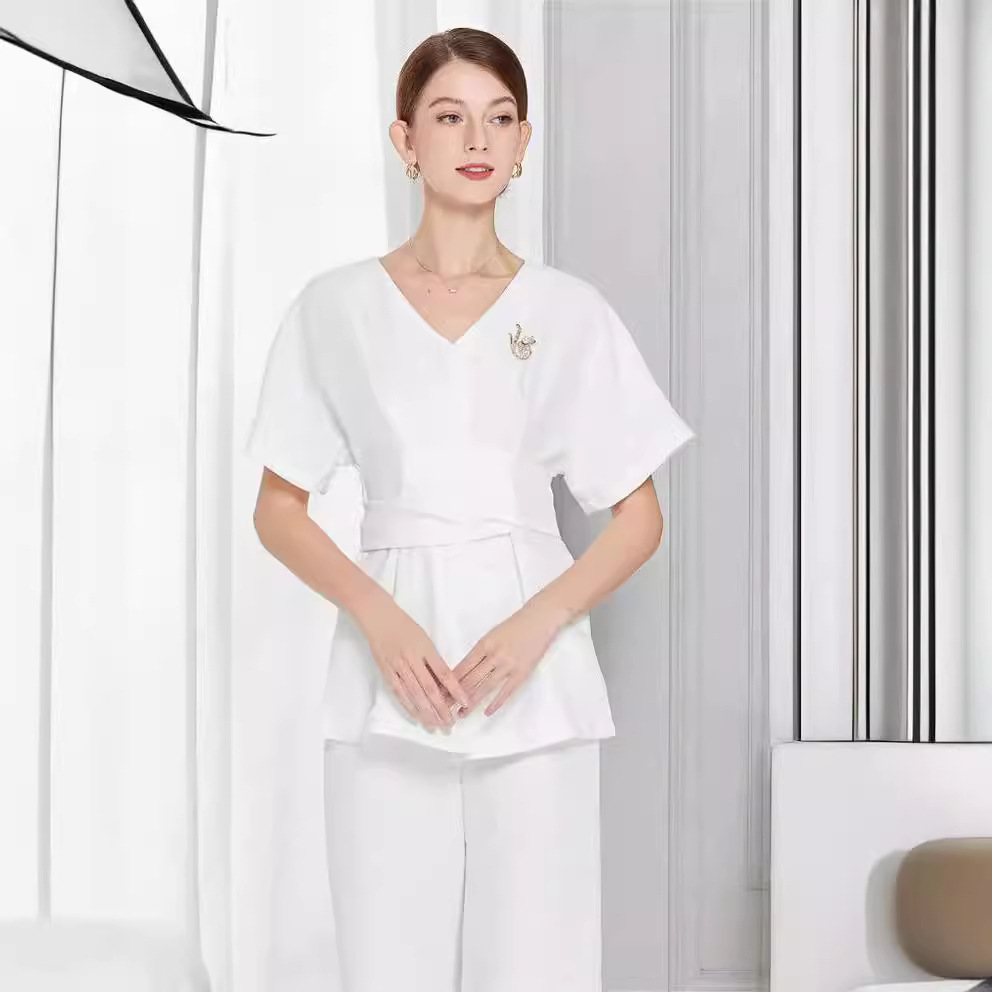 Setelan seragam pramugari Slim-fit seksi, pakaian teknisi sauna, pakaian pijat kaki, pakaian kerja pijat kaki, lengan pendek