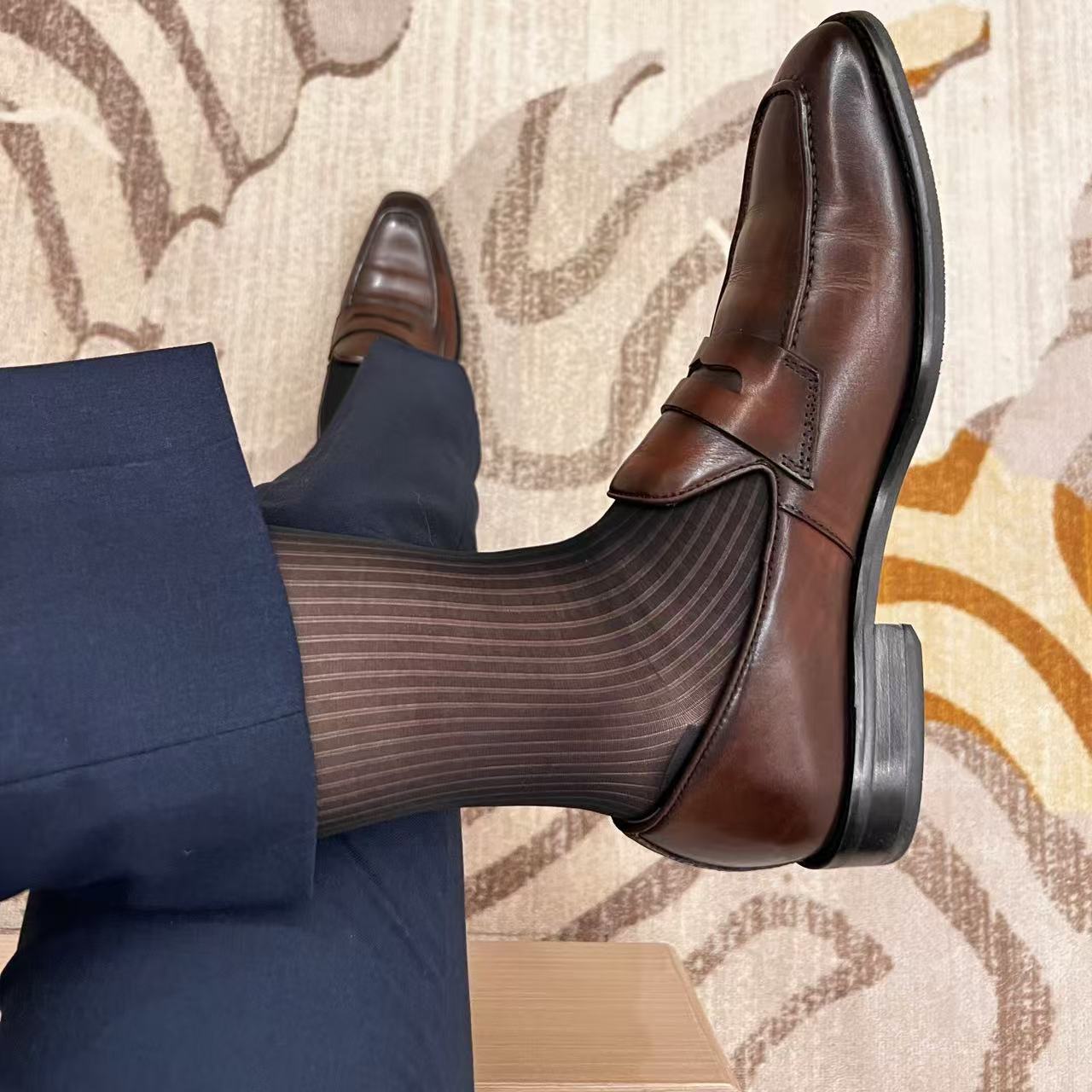 日本细条纹带脚型弯板脚跟加固男士商务中长锦纶西装丝袜