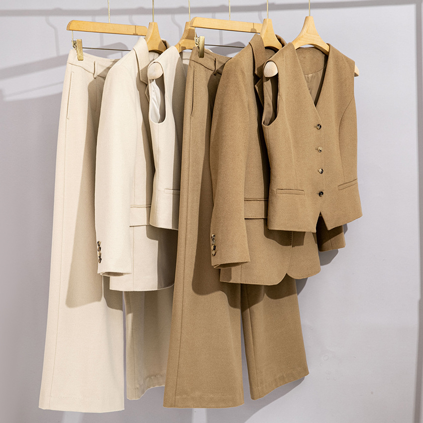 Setelan jas profesional modis untuk wanita, gaya musim semi dan gugur terbaru, setelan tiga potong yang elegan dan kasual untuk bentuk tubuh mungil.