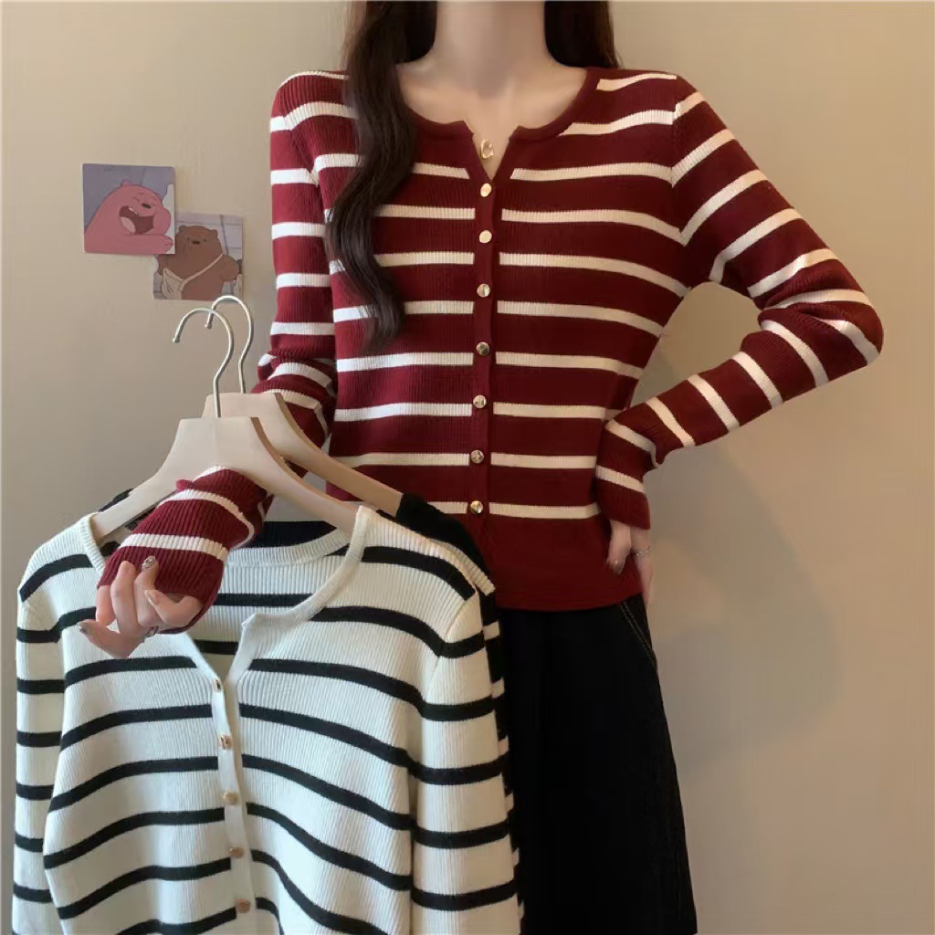 甜美女装韩版别致条纹针织开衫女辣妹秋季洋气遮肉显瘦长袖上衣潮