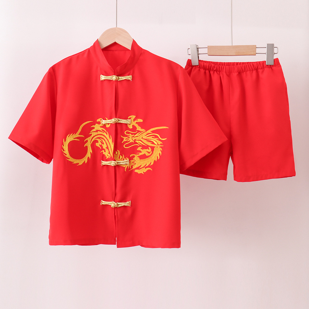 儿童立领演出服中国风唐装中式汉服短袖长短裤套装红色过年服男