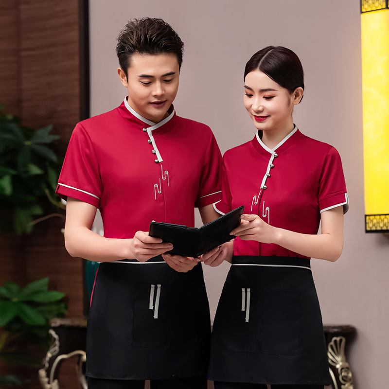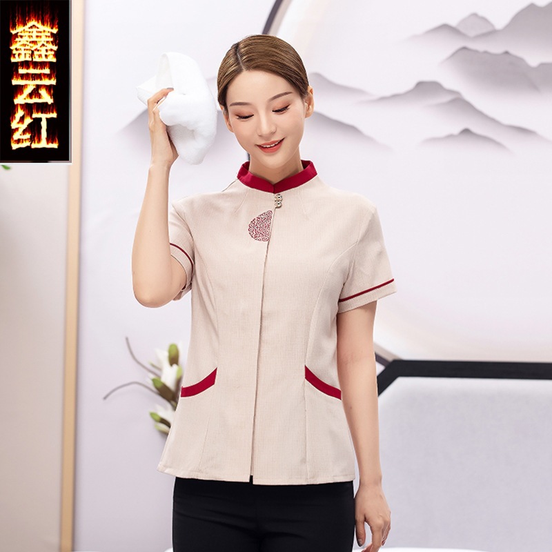Pakaian kerja pembersih hotel gaya Cina gaun musim panas bersirkulasi sulaman kerah merah lengan pendek ruang properti klub Hotel kakak tua