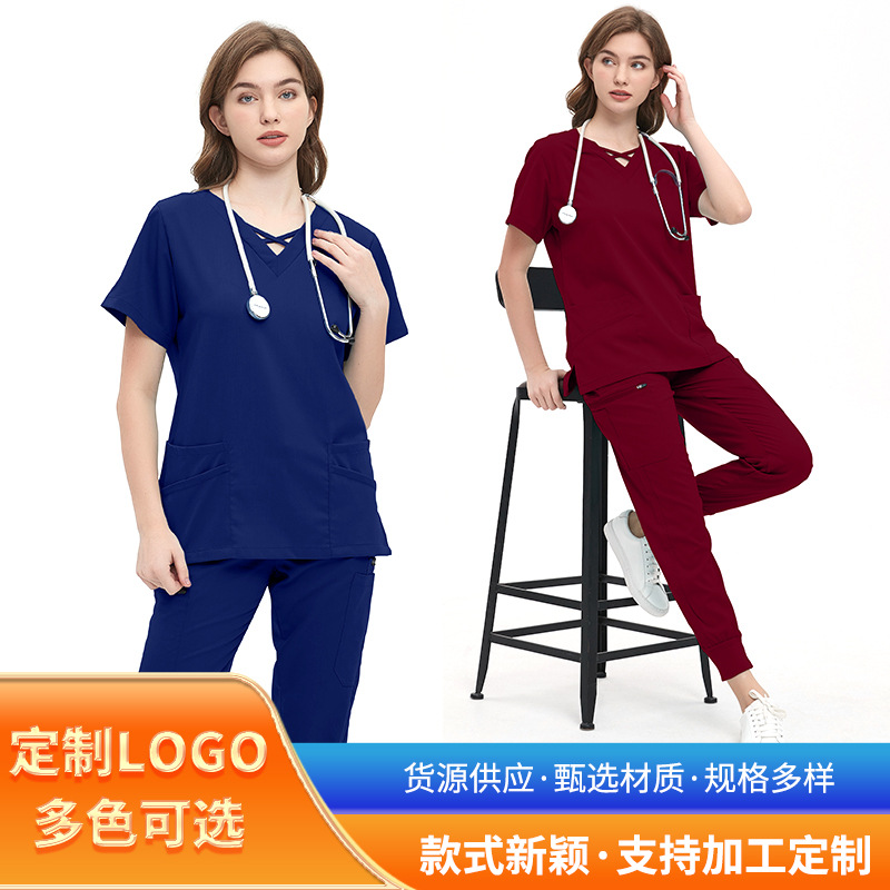Seragam perawat dua potong bergaya Korea kelas atas, seragam pengasuh, jas lab, setelan scrub medis V-neck untuk ruang operasi, lintas batas.