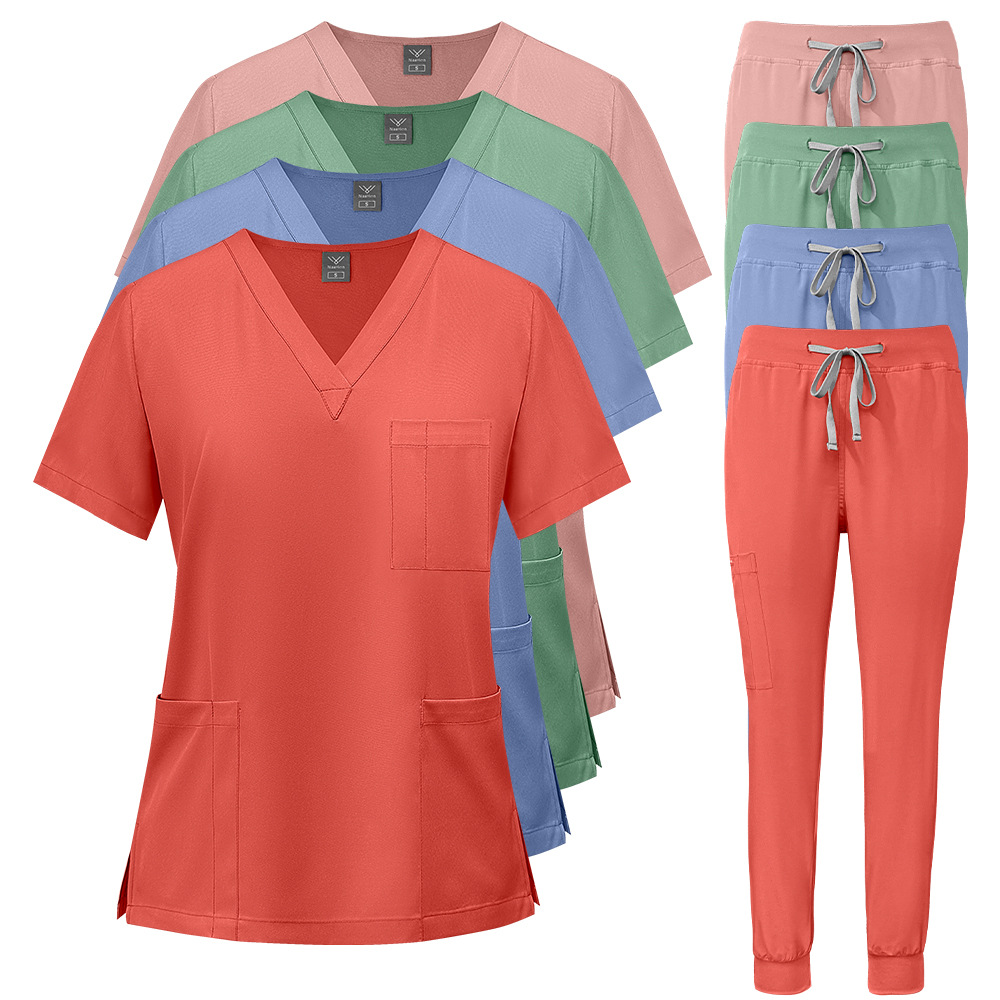 Atasan scrub lengan pendek yang nyaman dan mewah untuk staf pusat perawatan pascapersalinan, pakaian kerja musim panas untuk dokter di klinik gigi.