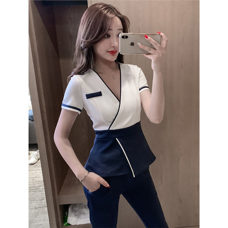 Baju kerja wanita pedikur, baju kerja temperamen pijat kaki, pakaian kerja salon kecantikan, pakaian teknisi penata rambut lengan pendek musim panas