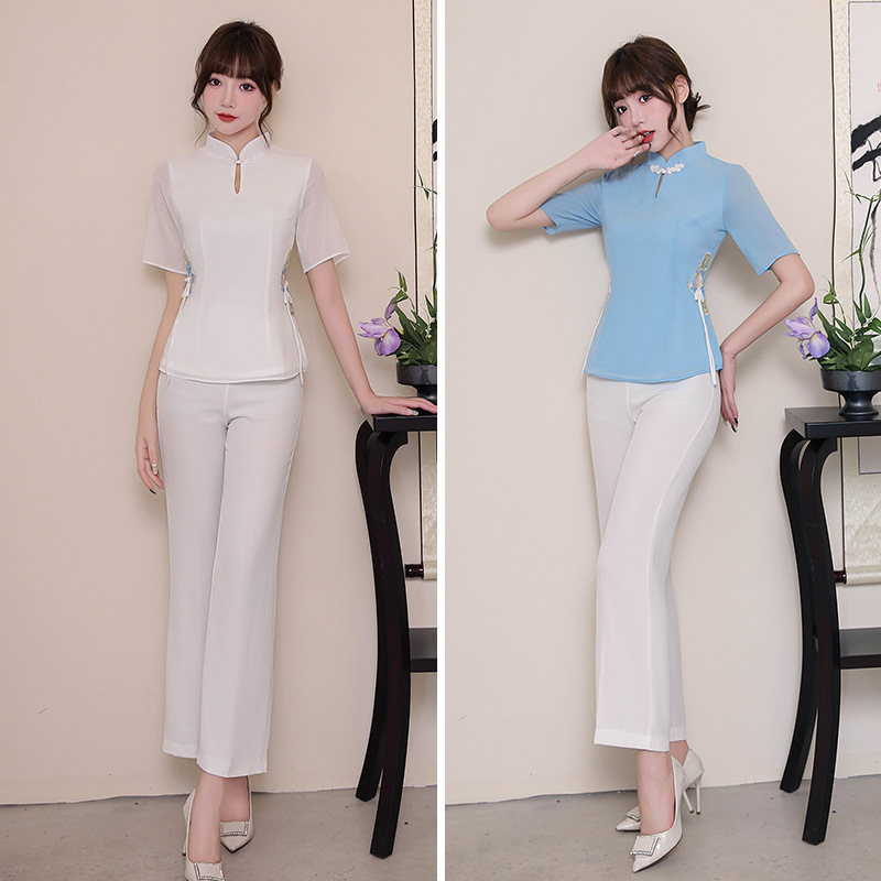 2673 Pakaian Kerja Wanita Teknisi Pemandian Telinga Retro Gaya Tiongkok Model Baru Musim Semi dan Musim Panas Pakaian Kerja SPA Terapi Kaki Gaya Nasional
