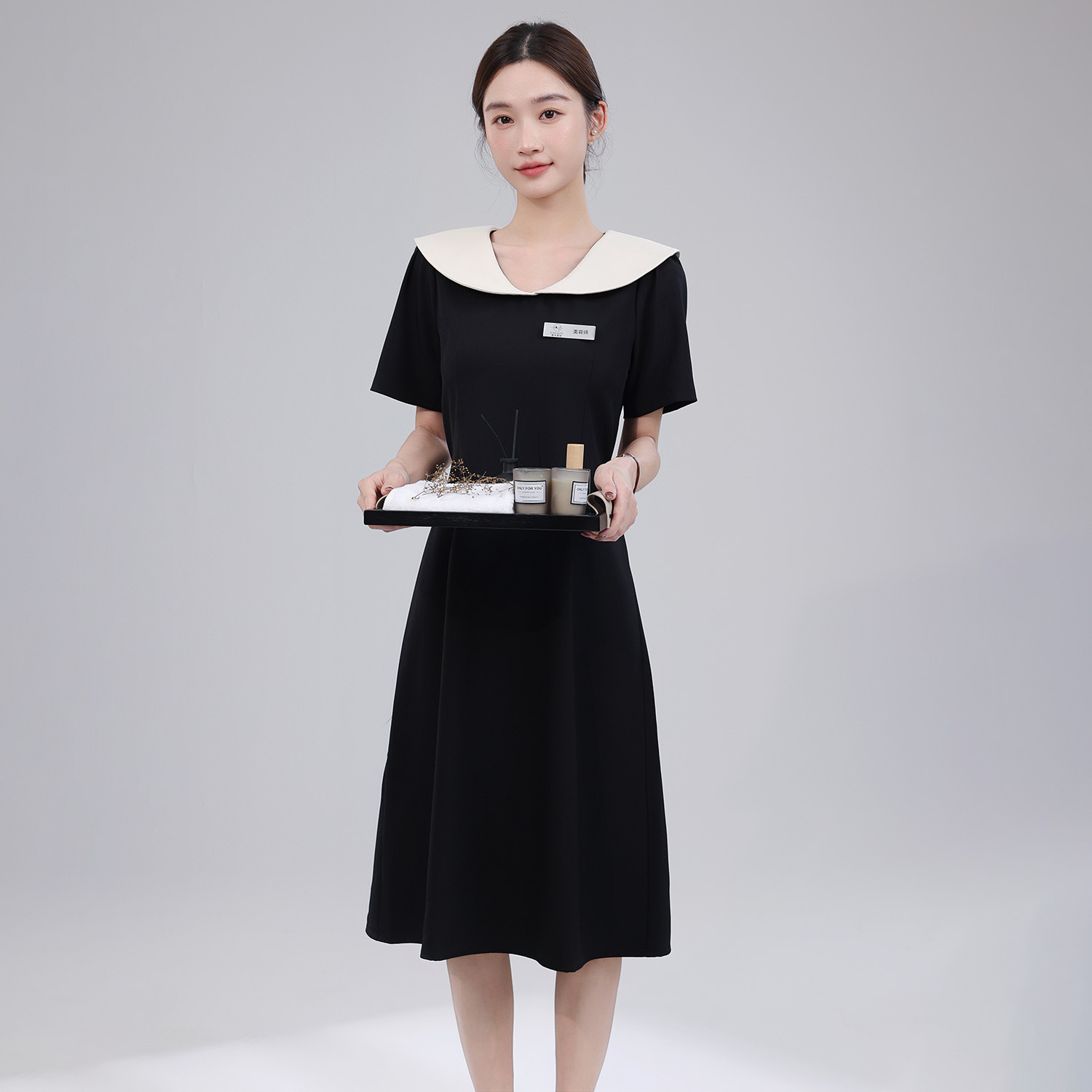 Gaun Profesional Ahli Kecantikan Model Baru Tahun 2025 Musim Panas Gaun Kerah Boneka Lengan Pendek Wanita Gaya Prancis Elegan