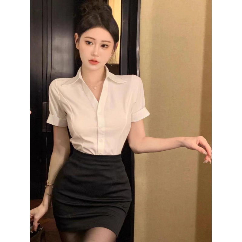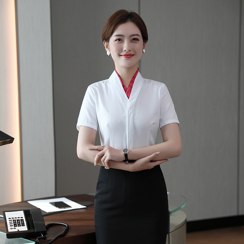 Kemeja Lengan Pendek Terlihat Langsing Pinggang Kerah V Seksi Seragam Pramugari Pakaian Kerja Teknisi Pedikur Seksi Sederhana KTV 2300