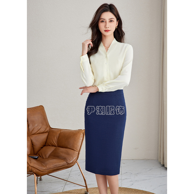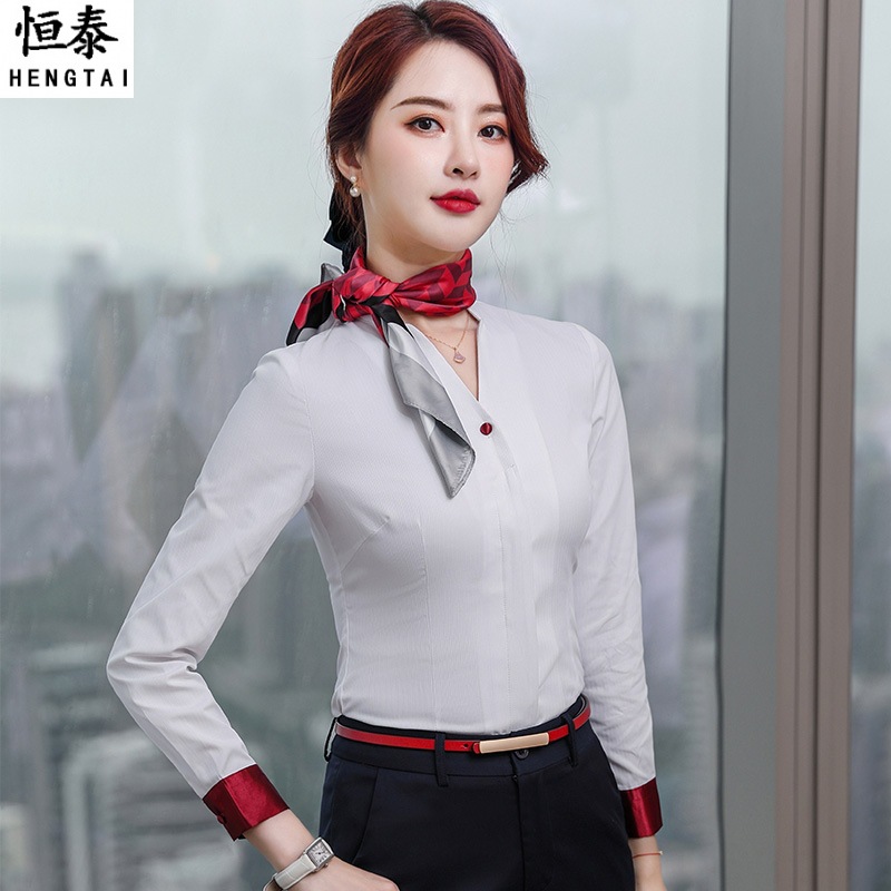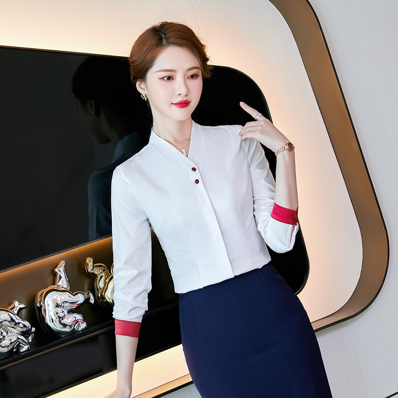 Kemeja putih profesional untuk wanita 2024 gaya baru pramugari hotel pakaian kerja elegan kemeja kerah v atasan kerja musim semi & gugur
