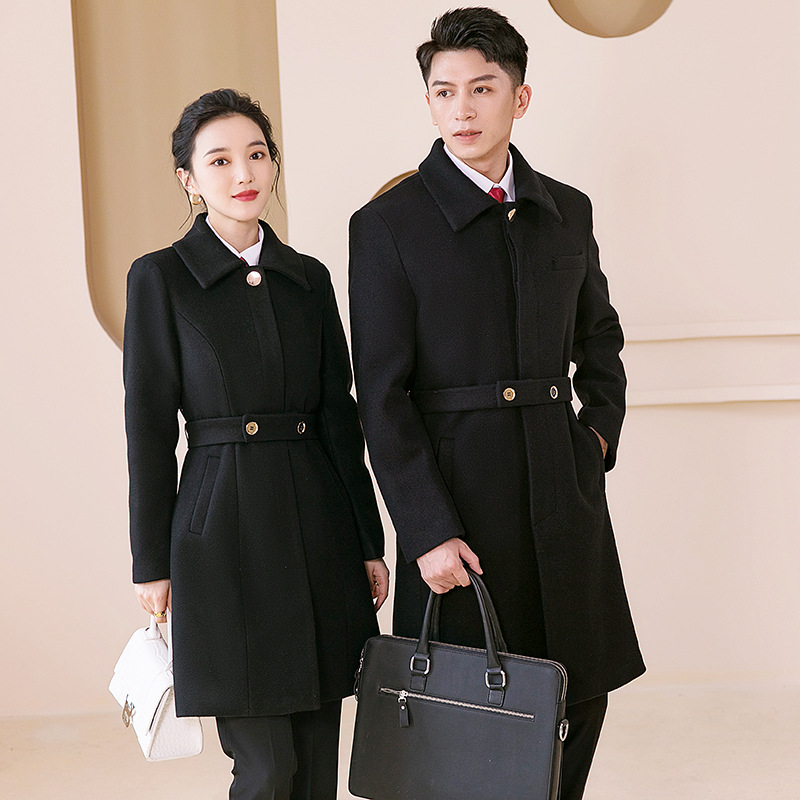 Pakaian bisnis berlapis katun musim dingin pakaian kerja wol untuk pria dan wanita pakaian kerja yang sama departemen penjualan pramugari mantel wol panjang menengah