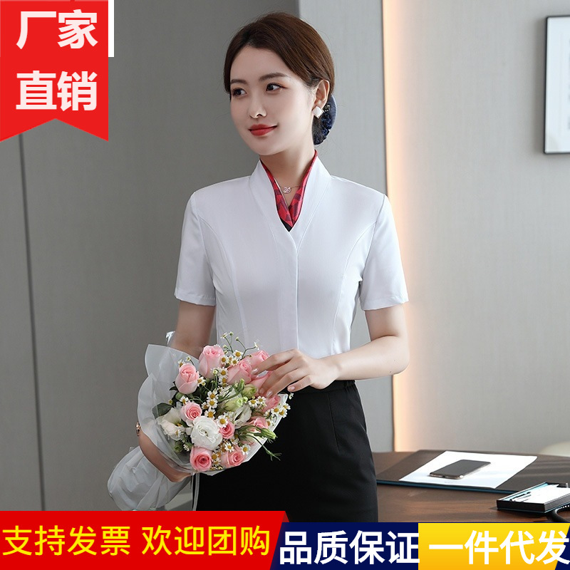 Pakaian Wanita Profesional Seragam Pramugari Pakaian Kerja Departemen Penjualan Toko Perhiasan Meja Depan Hotel Atasan Kemeja Lengan Pendek