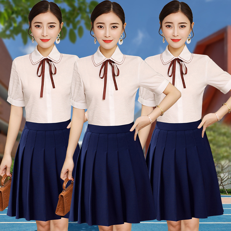 Pakaian Bisnis Wanita lengan pendek rok setelan musim panas hotel kemeja bisnis renda busur kemeja pramugari rok berlipat