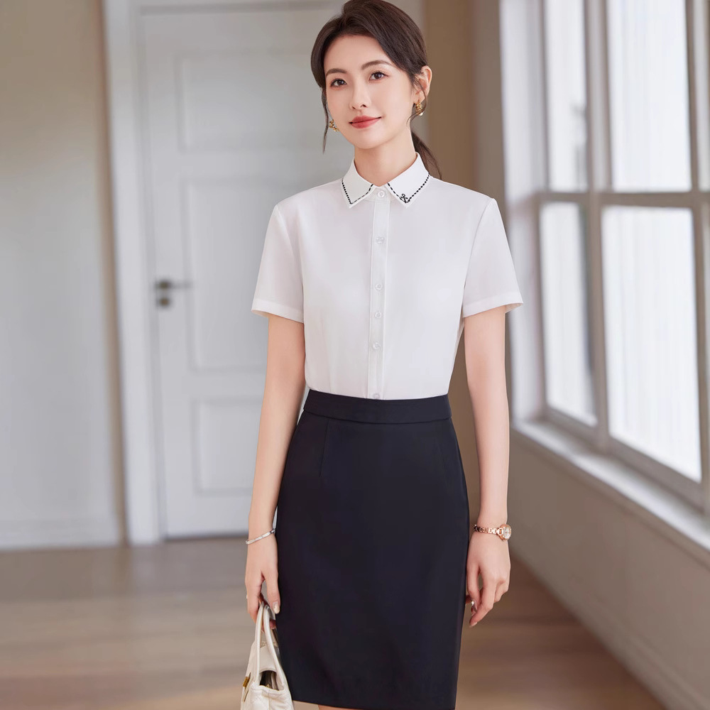 Kemeja Profesional Pramugari Elegan Lengan Pendek Wanita Pakaian Profesional Musim Panas 2025 Kemeja Layanan Pelanggan Properti Kerah Putih Kecantikan Meja Depan