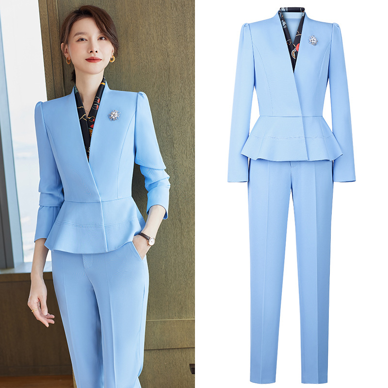 Sky Blue pakaian kerja profesional wanita, setelan slim-fit musim semi dua potong pakaian kerja meja depan seragam pramugari